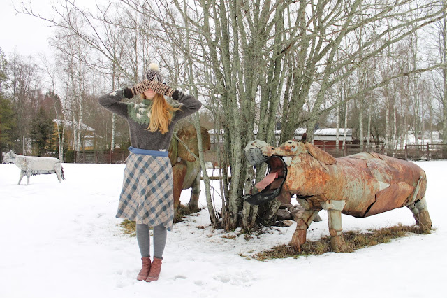 | Hattu ja neulepaita ovat omatekoisia. Hattu on Snowfall hat ja paita muokattu versio Lampaankasvattajan paidasta. Lapaset löytyvät kotoa ja ovat vanhat ja luultavasti isoäidin tai isotädin neulomat. Sukkikset lahja ja kengät uutena ostetut. The Snowfall hat and the sweater that is a modification of a Finnish pattern Lampaankasvattajan paita are diy. The mittens are decades old and found at home and likely made by either by my granny or her sister. The stockings were a gift and the shoes I bought as new. |