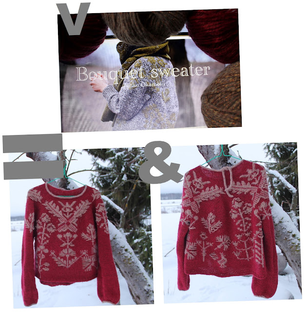 | Tässä on tämän vuoden jouluneuleeni, japanilaissuunnittelija Junko Okamoton Bouquet Sweater -ohjeella neulottu paita valmiina. Langat on punaista Gedifran Anejaa ja metallinväristä Filati da Collezionen Fun-lankaa. Molemmat langat saattavat olla jo pois tuotannosta, sillä löysin ne alekoreista lankakaupassa ja tavaratalossa noin vuosi sitten. Puikot 4 mm ja 4.5 mm. This is my Christmas jumper of the year, the Bouquet Sweater by Japanese designer Junko Okamoto. I used 4 mm and 4.5 mm needles. The yarns are bargain finds and might be discontinued. The red yarn is Gedifra Aneja and the bronze colour yarn is Filati da Collezione Fun. Both yarns are made in Italy by German brands, which makes me feel both fancy and that I'm in safe hands. |