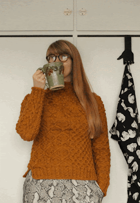 | Neulemekko ja kukkalapaset on omatekoisia ja poolo sekä hattu kirppislöytöjä. The knitted dress and mittens are DIY. Hat and turtle-neck are thrifted. |